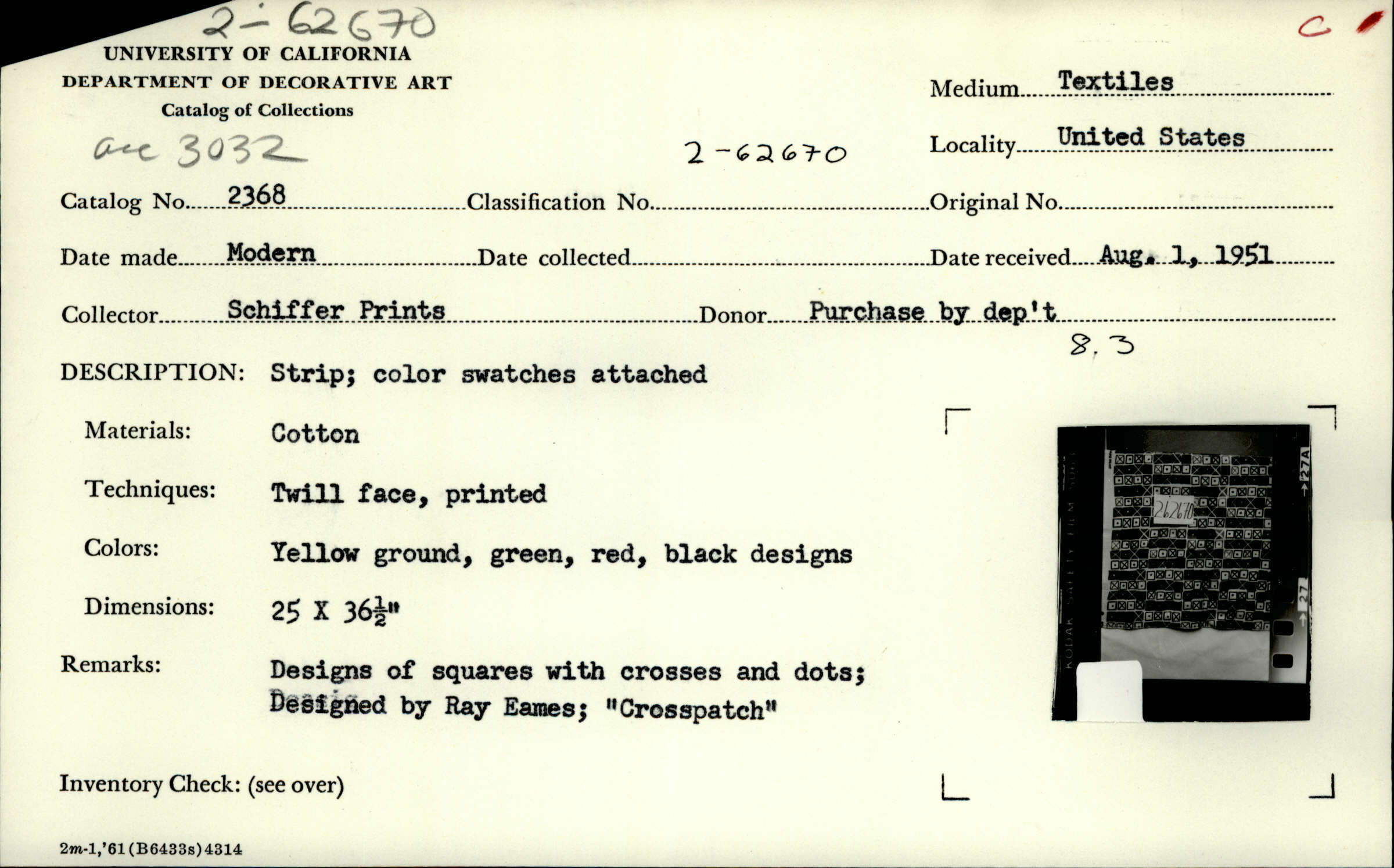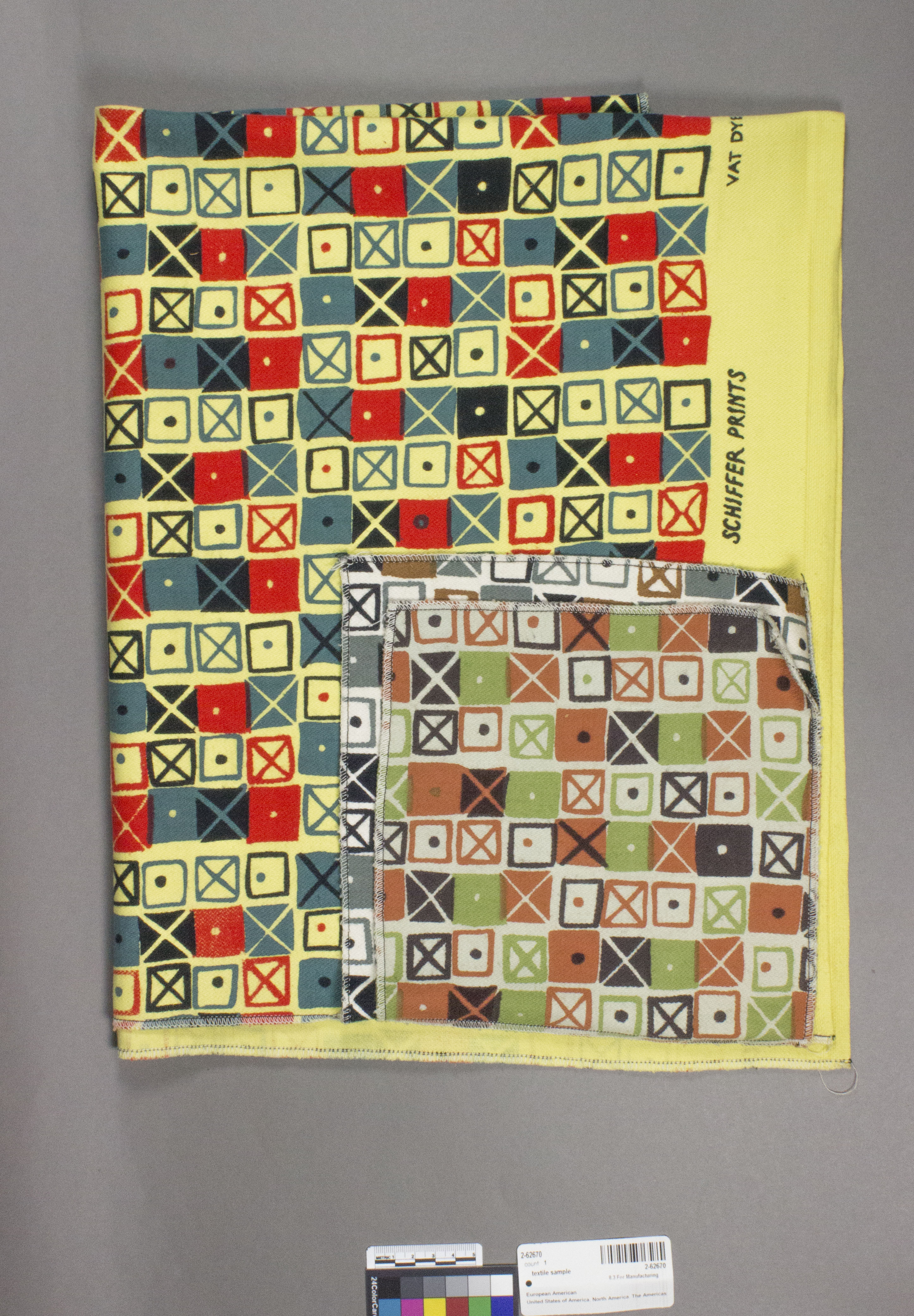 Strip; color swatches attached, cotton, twill free, printed, yellow ground, green, red and black designs, designs of squares with crosses and dots, designed by Ray Eames, “Crosspatch”