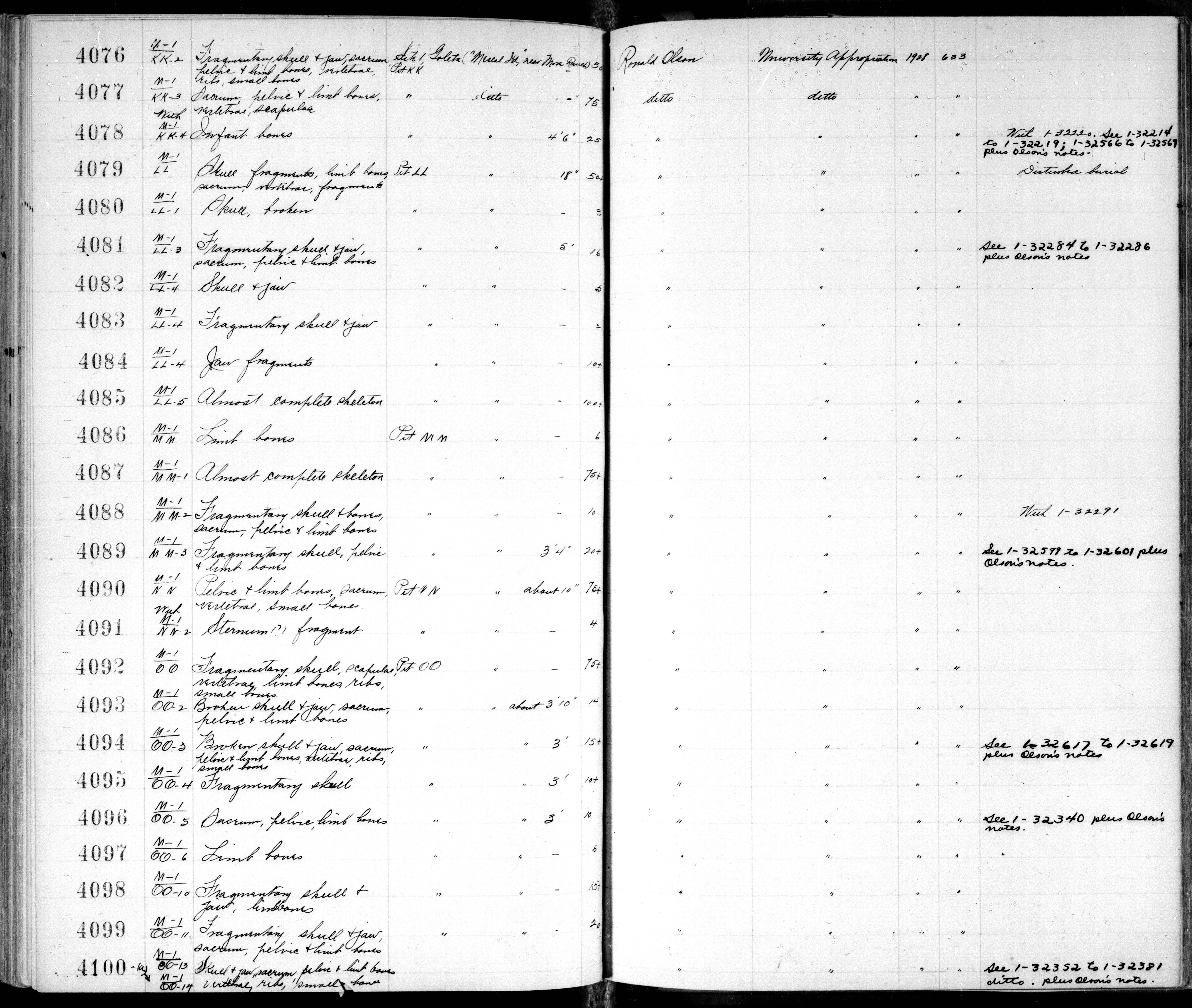 12-4085 (previous museum number (recataloged from), Right humeral head, see annotations), 12-4089 (previous museum number (recataloged from), Right femur, see annotations), and M-1/LL-3 (original number)