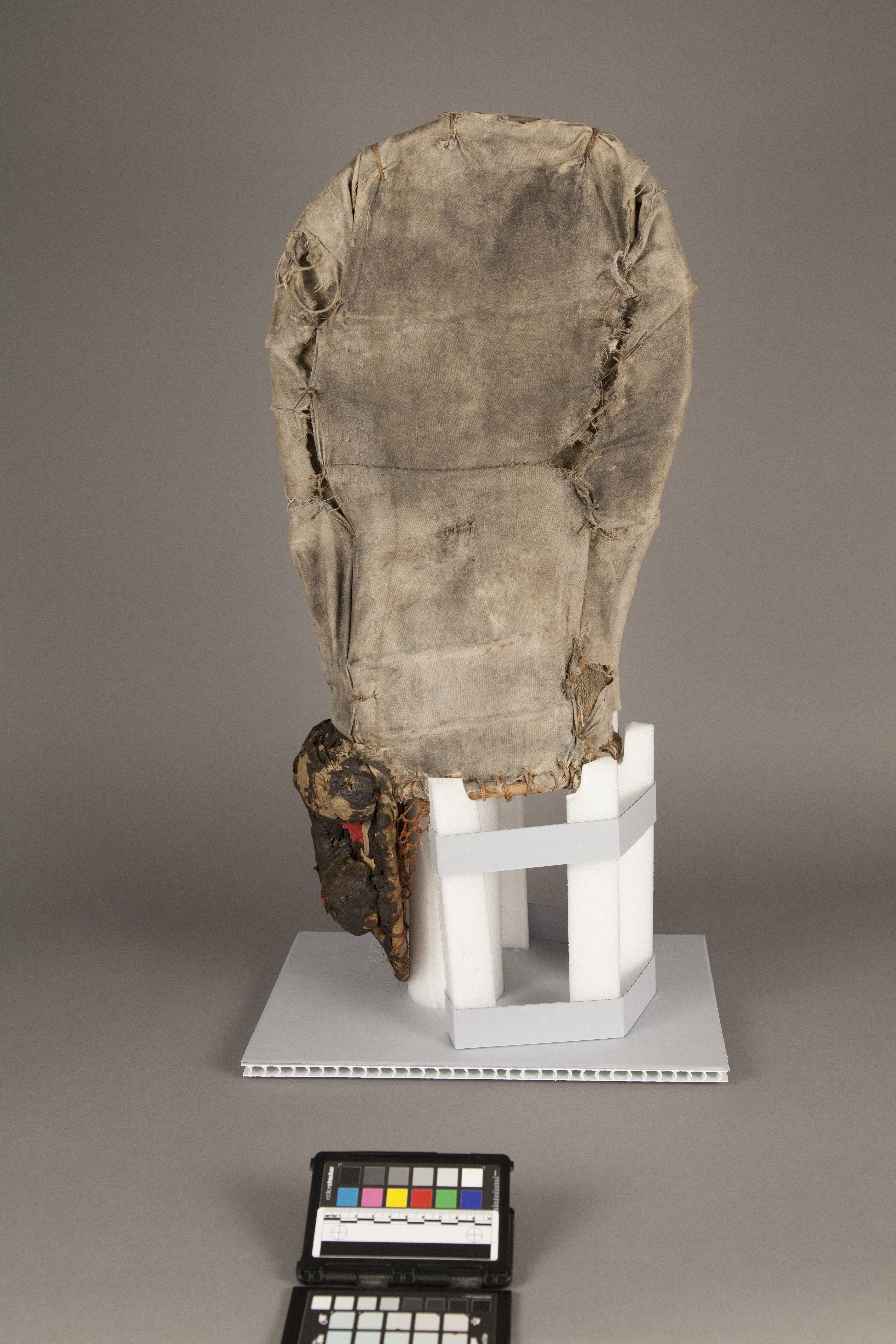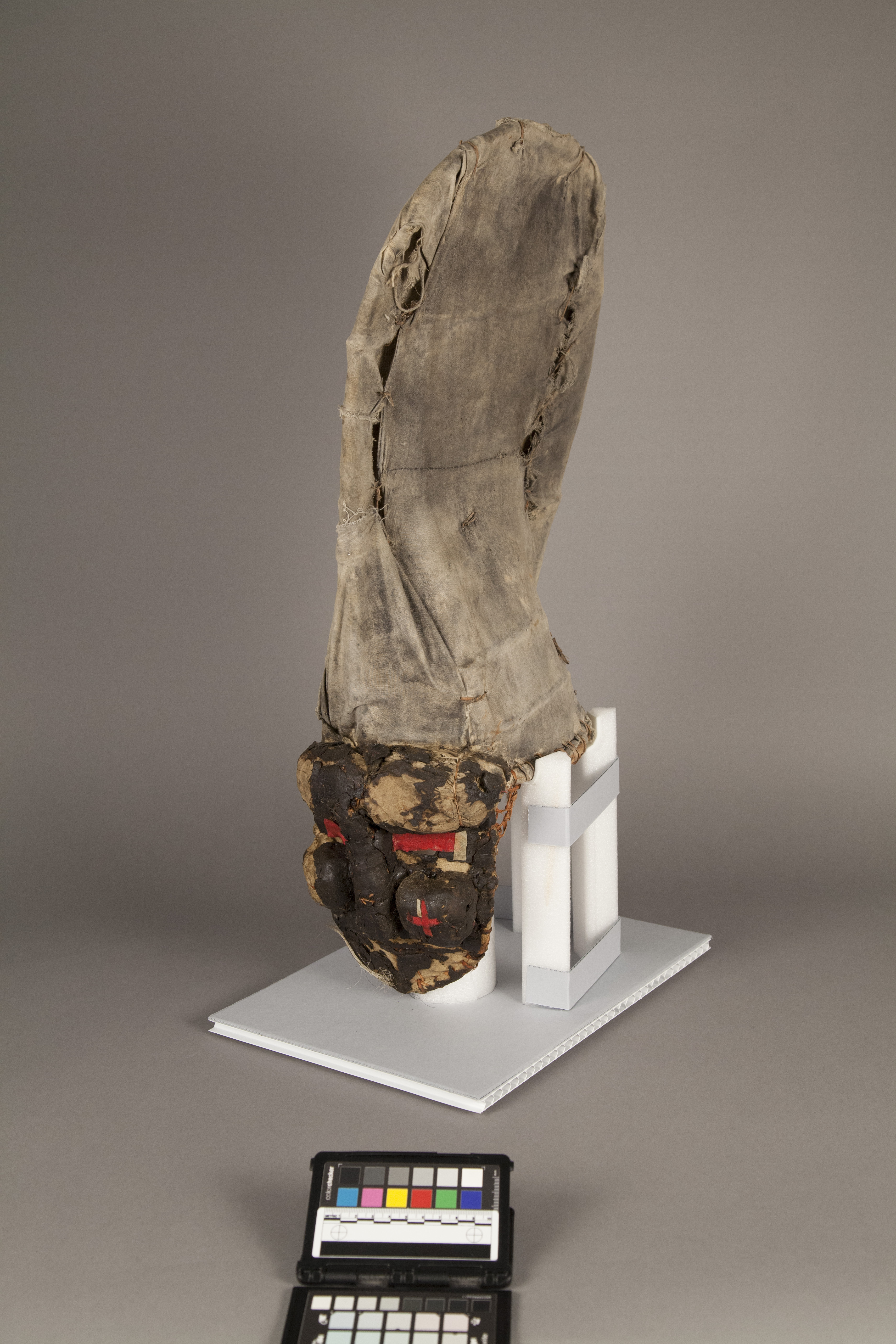 - Mask; resin over cloth; inset eyes; ball cheeks; black with red and white. Height 69 cm.