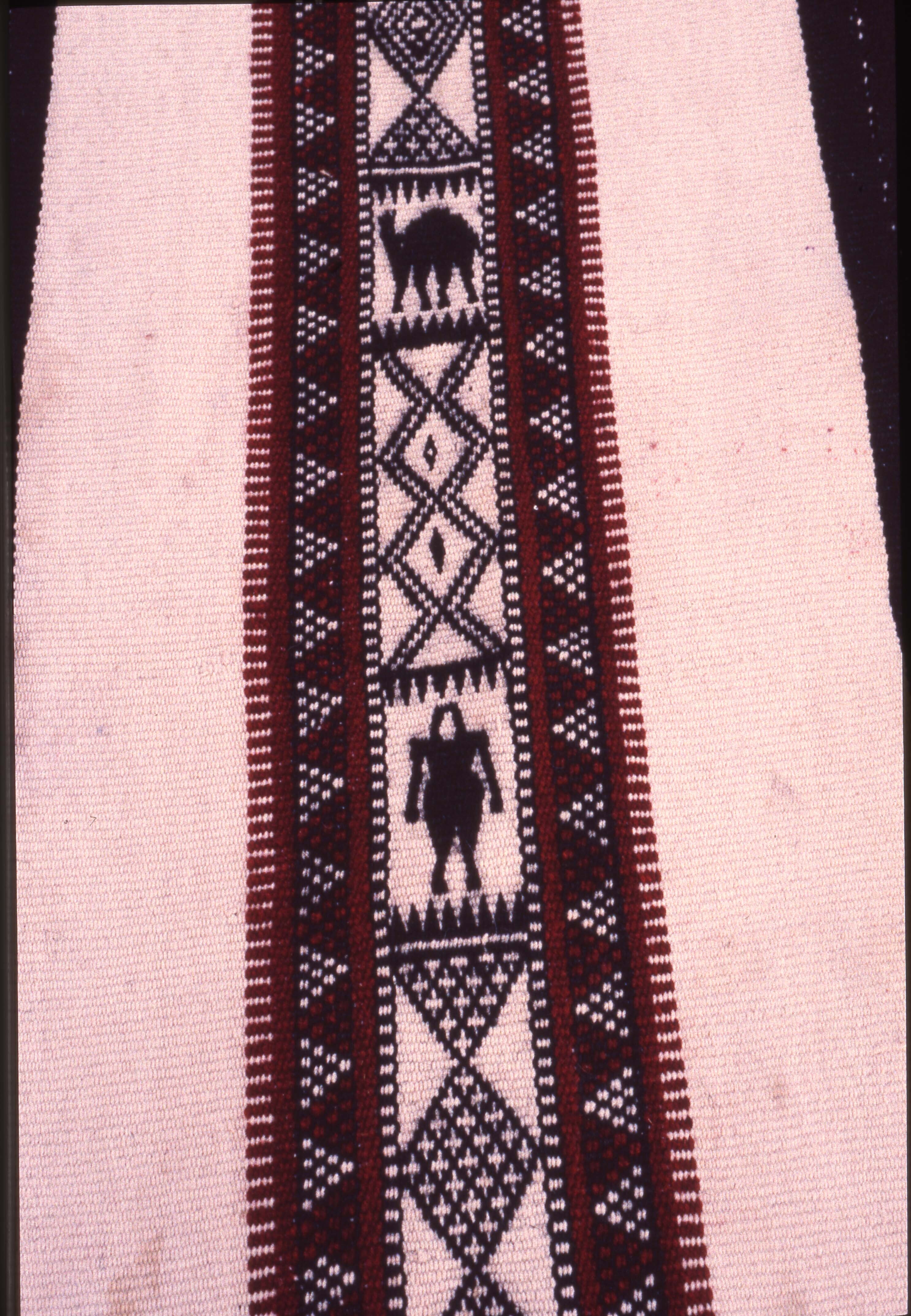 - 35mm color slide transparency. Close-up of textile with woven images including a camel and a person; colored red, black, and white.