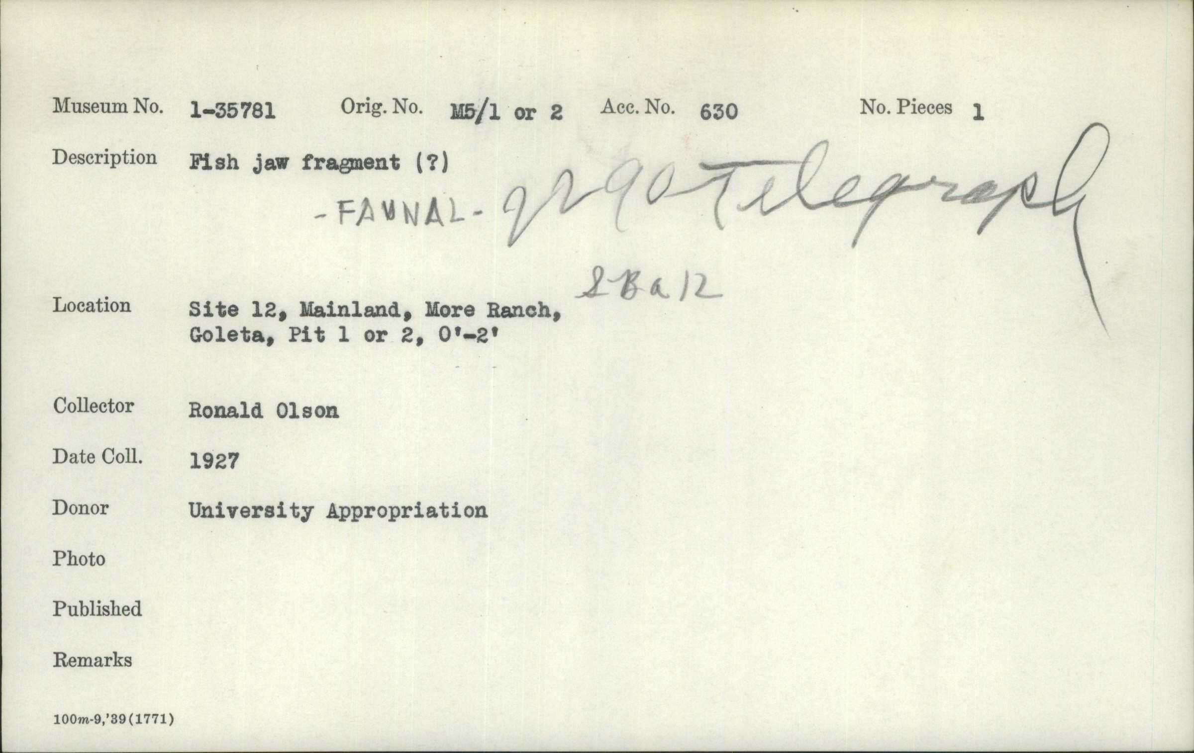- G. M. Stirling, Ronald Leroy Olson, Santa Barbara Museum of Natural History, University Appropriation, and Willard W. Hill