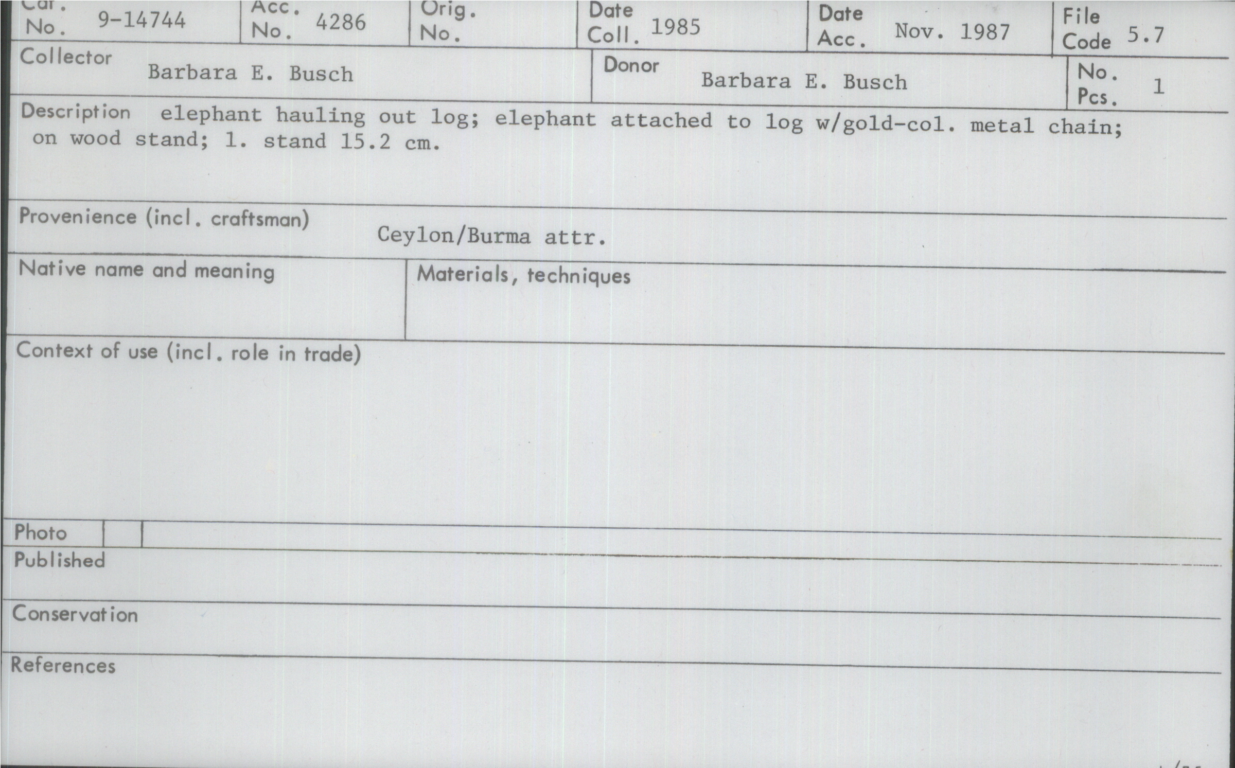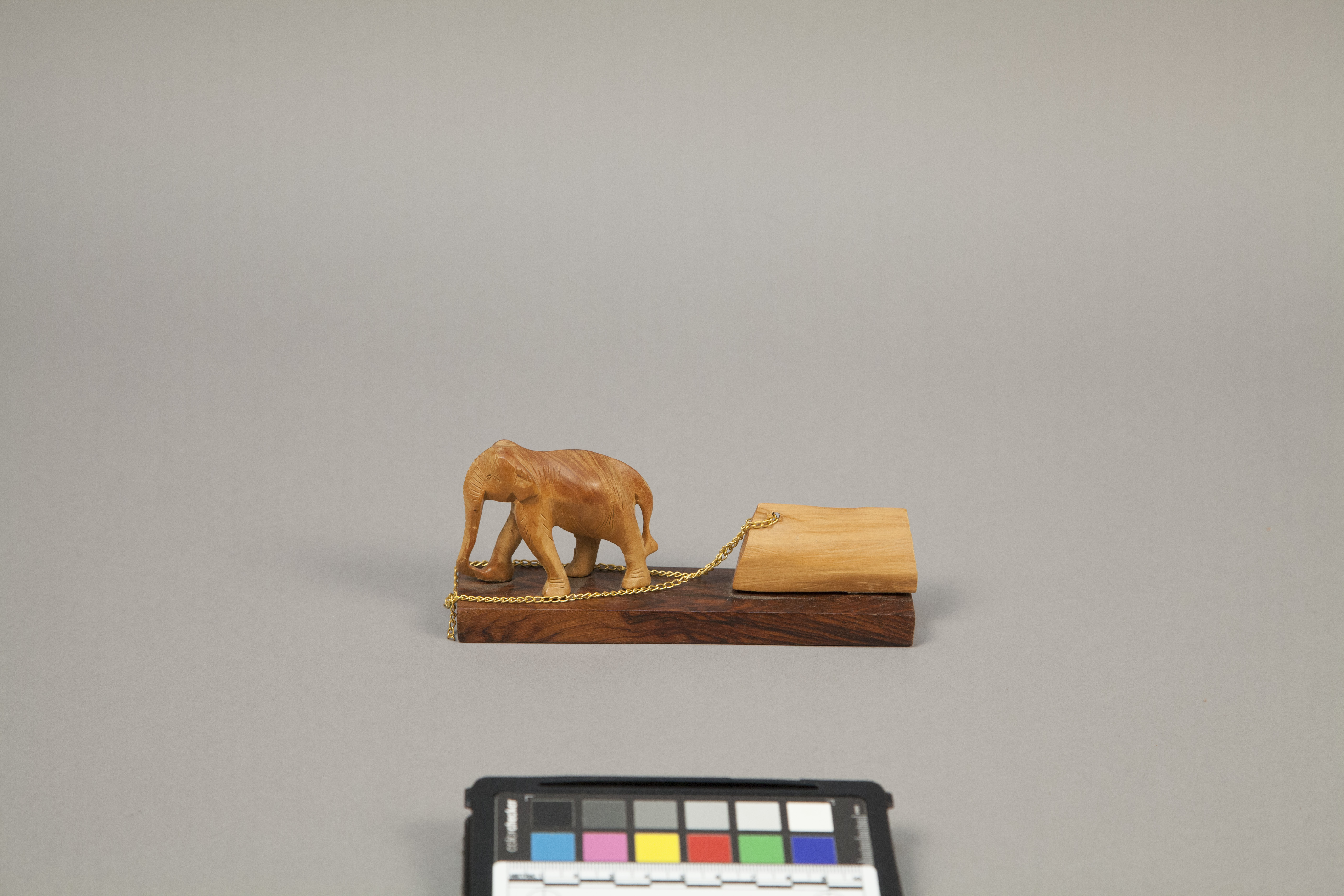 - elephant hauling out log; elephant attached to log w/gold-col. metal chain; on wood atand; L. stand 15.2 cm.