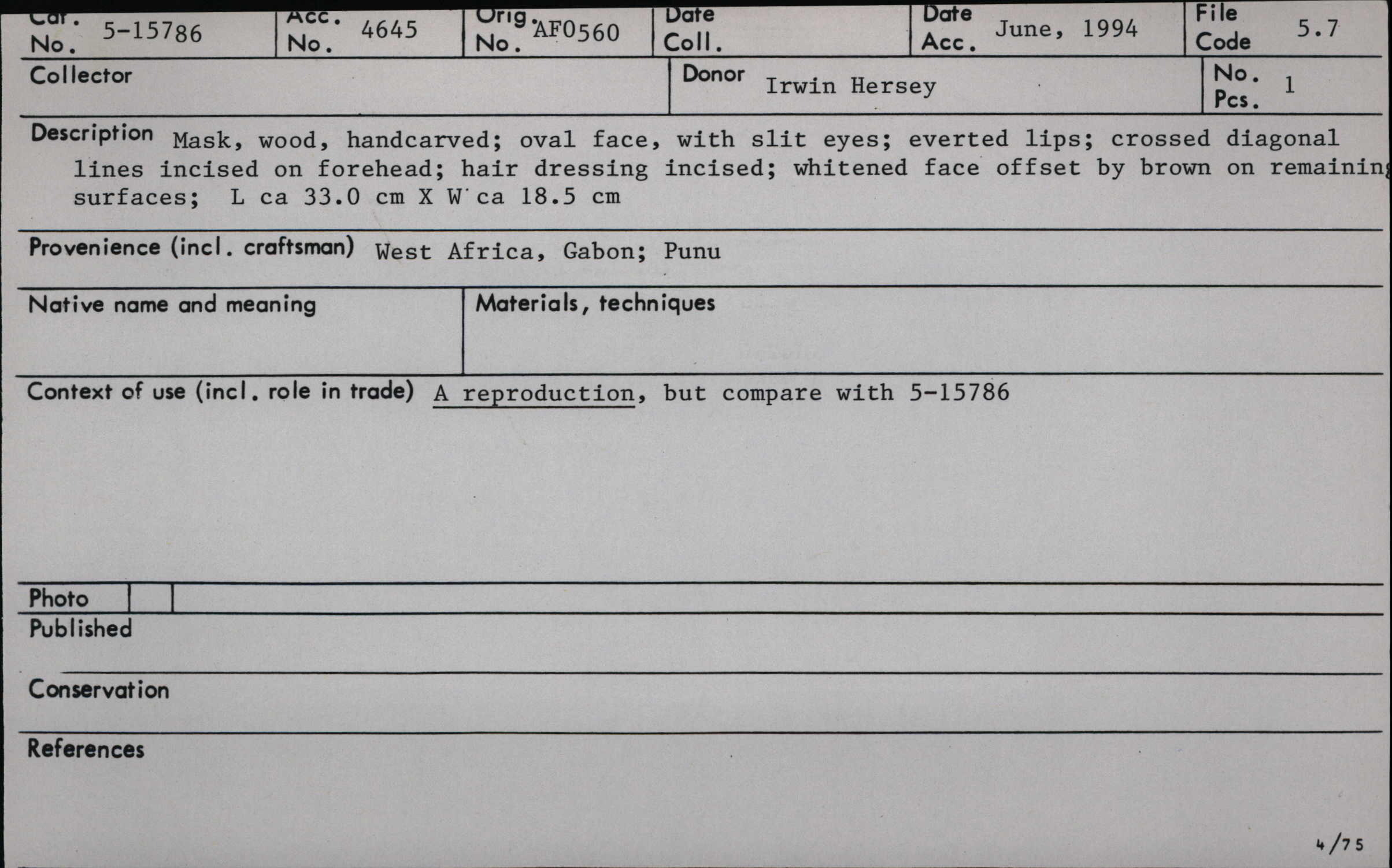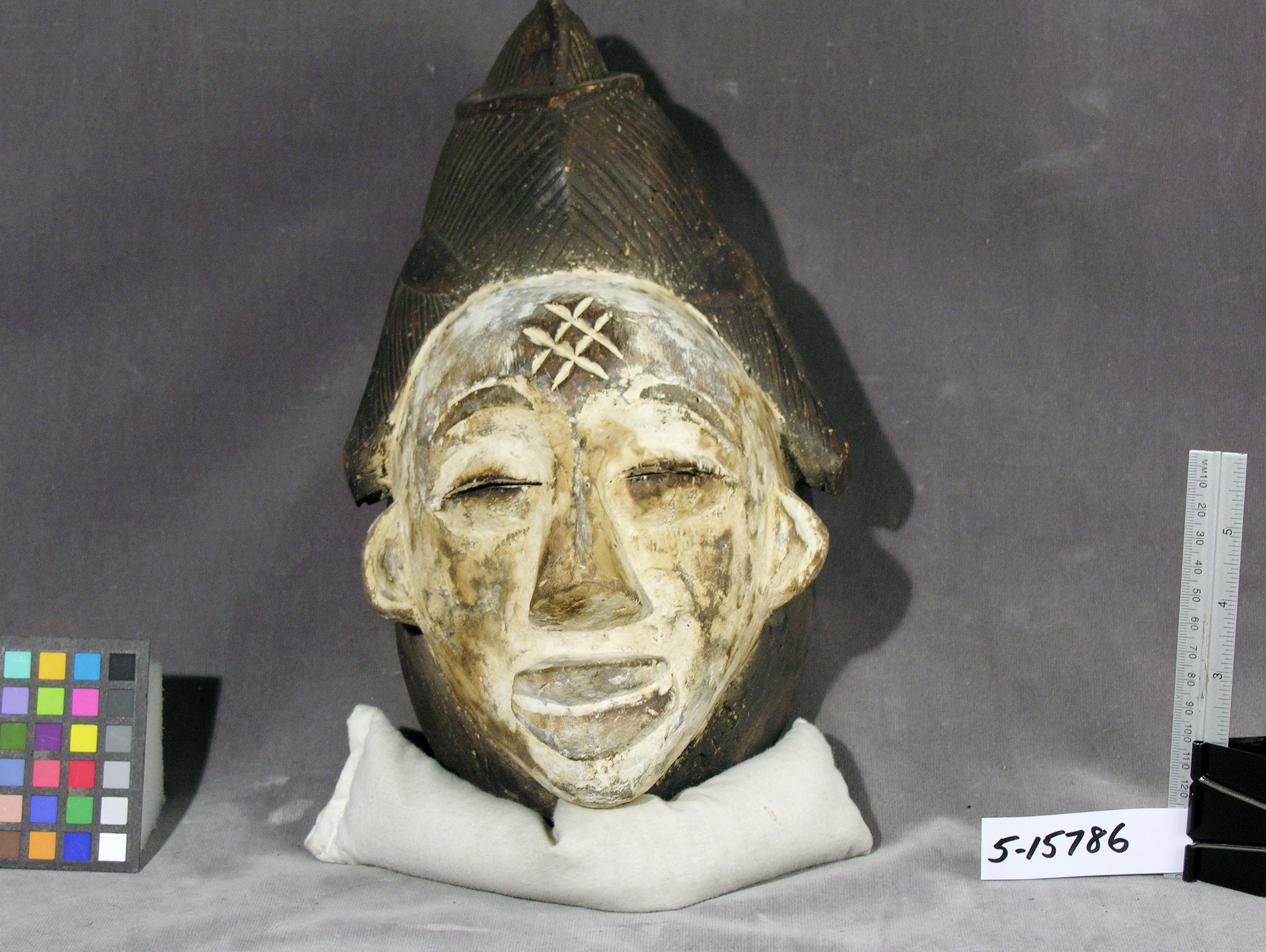 Mask, wood, handcarved; oval face, with slit eyes; averted lips; crossed diagonal lines incised on forehead; hair dressing incised; whitened face offset by brown on remaining surfaces; Length: 33 cm, Width/breadth: 18.5 cm