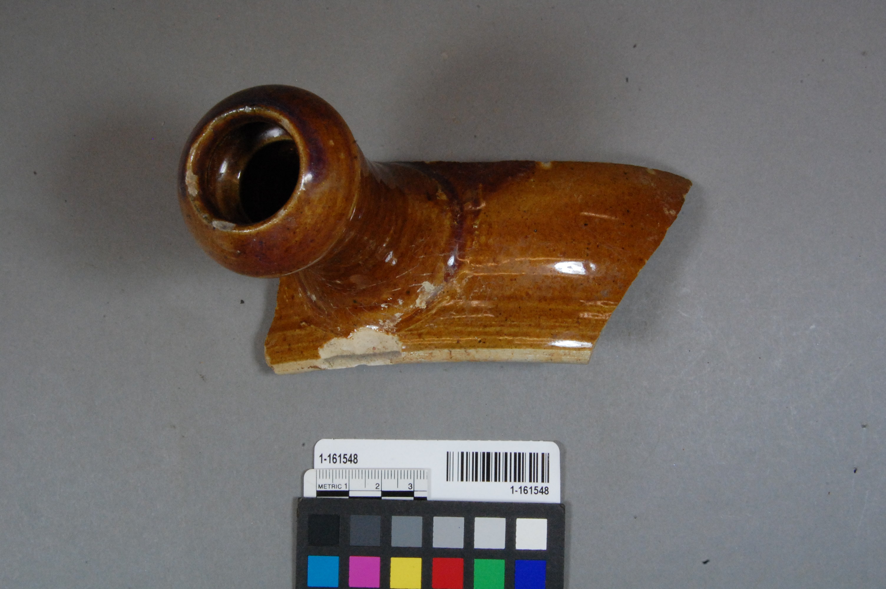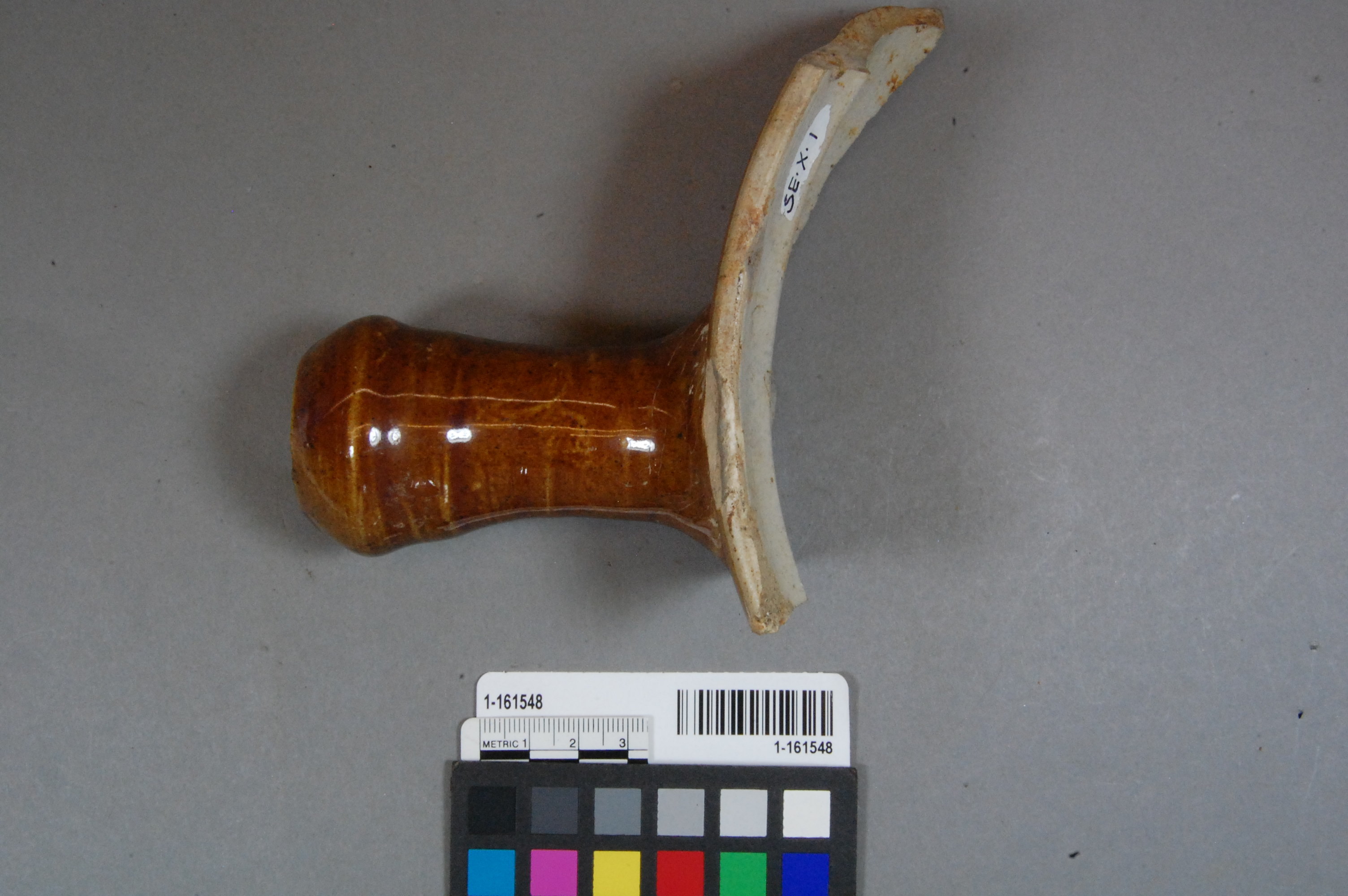 Fragment of a wheel thrown hollow handle tan stoneware flat bottom casserole or soup dish, with underglazed tannish brown exterior, no other decoration or makers mark