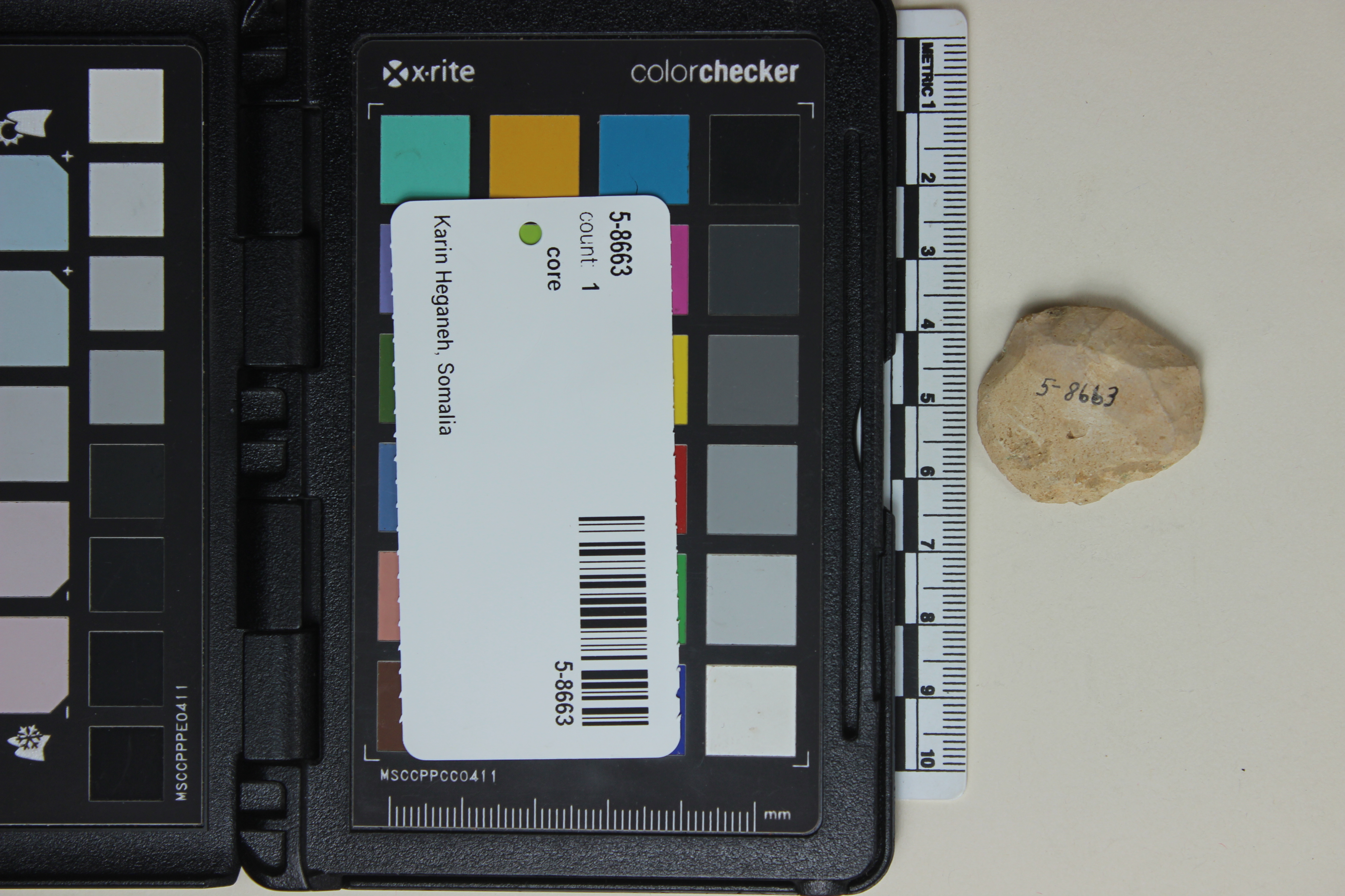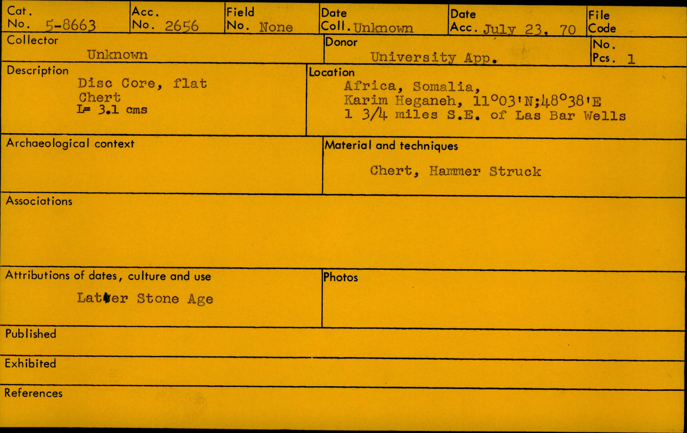 - Disc core, flat, chert; Length 3.1 cm