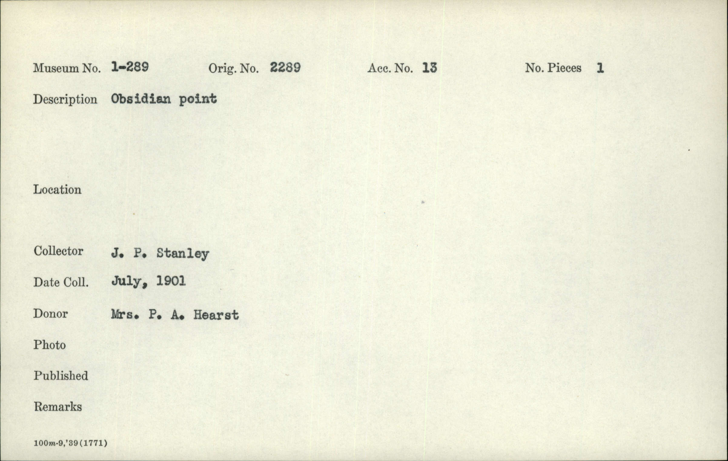 The majority of John Preston Stanley's archaeological collections were from Sonoma county. He also collected in Coos, Umatilla and Wasco counties in Oregon, Amador, Del Norte, Humboldt, Lake, Marin Shasta, and Tulare counties in California as well as in Illinois and Ohio.